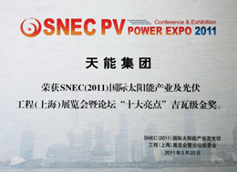 ![]() 2011年國際太陽能產業及光伏工程(上海) 展覽會暨 論壇「十大亮點」吉瓦級金獎 |